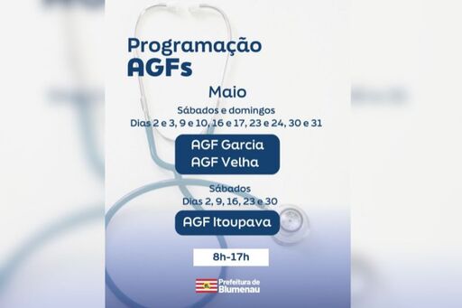 A Prefeitura de Blumenau mantém os AGFs Garcia, Velha e Itoupava abertos nos fins de semana de maio, em Blumenau. As unidades oferecem consultas das 8h às 17h e vacinação aos sábados (9h às 16h), visando garantir assistência médica ambulatorial e imunização para a comunidade local durante o mês.