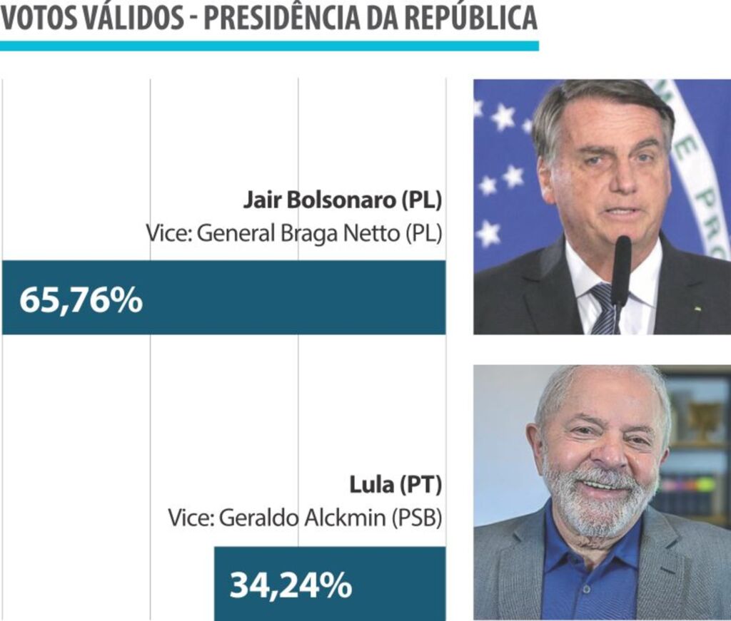 Na disputa à presidência da República, a chapa do atual presidente, candidato à reeleição, Jair Bolsonaro (PL), que tem como vice o general Braga Netto (PL), aparece com 65,76% dos votos válidos, descontadas, portanto, a indicações de votos brancos, nulos e daqueles que não sabem ou não opinaram . A chapa de Luiz Inácio Lula da Silva (PT)/Geraldo Alckmin (PSB) registra 34,24% dos votos válidos.
