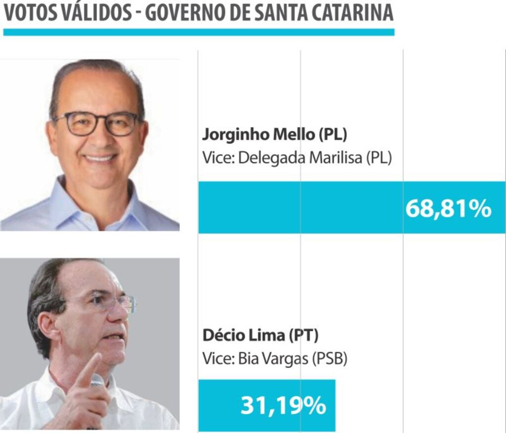 Na eleição ao Governo de Santa Catarina, o levantamento da Visão Pesquisas apontou um amplo favoritismo da chapa Jorginho Mello (PL)/Delegada Marilisa (PL), que recebeu 68,81% da preferência dos eleitores entrevistados, considerando-se apenas os votos válidos. Já a chapa Décio Lima (PT)/Bia Vargas (PSB) obteve 31,19% dos votos válidos.